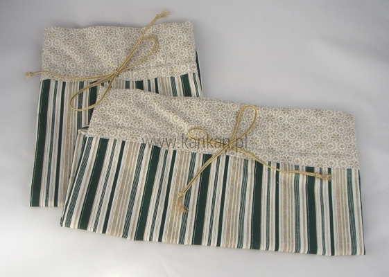Dwa woreczki na prezent i nie tylko. Uszyte starannie z bawełnianych tkanin we wzorach z jednej kolekcji. Ściągane u góry ozdobnym sznureczkiem wciągniętym w tunelik.