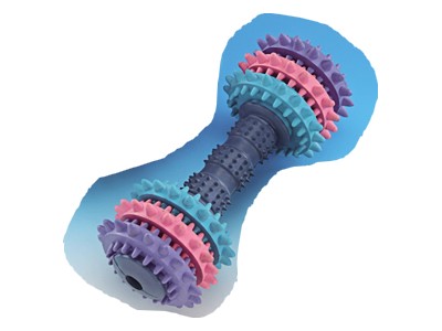 Kolorowe duże hantle z pełnej gumy ciężkie. Kształt zabawki wspomaga oczyszczanie zębów.