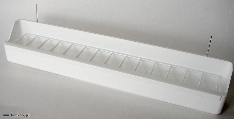 'Długi karmnik z grubego tworzywa sztucznego dość obszerny wygodnie wieszany na drucikach na kracie klatki czy woliery. W komplecie z wyjmowaną kratką aby ptaki mniej rozsypywały ziarenka.'