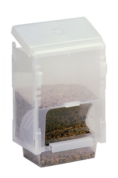 Karmnik do zawieszenia od wewnątrz lub na zewnątrz klatki. Mieści 1 kg ziarna. Wydatnie zmniejsza czas hodowcy jaki musi poświęcić on na codzienną pielęgnacje hodowli kanarków lub drobnej egzotyki.