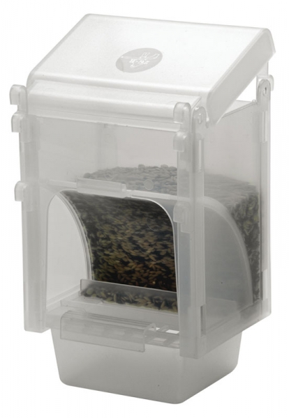Karmnik do zawieszenia od wewnątrz lub na zewnątrz klatki. Mieści ok. 250g ziarna. Wydatnie zmniejsza czas hodowcy jaki musi poświęcić on na codzienną pielęgnacje hodowli kanarków lub drobnej egzotyki.
