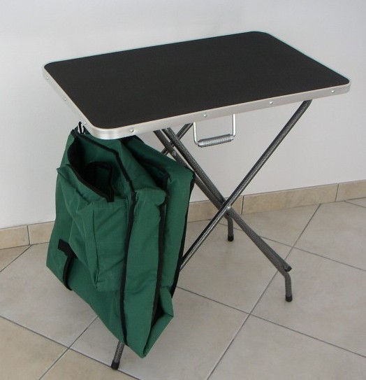 Lekki bardzo łatwo stawiany stół trymerski wraz z wygodną torbą z pojemnymi kieszeniami na akcesoria butelkę z wodą. Idealny na wystawy i dla groomerów dojeżdżających do klienta.