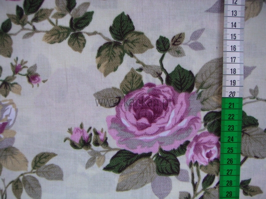 Tkanina bawełniana z nadrukiem dużych różowo - fioletowych róż z liśćmi na kremowym tle.