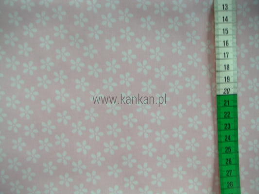 Tkanina bawełniana z nadrukiem drobnych białych kwiatków na bladym różu.