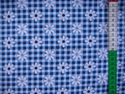 Tkanina bawełniana z nadrukiem białych stokrotek na biało - niebieskiej kratce.